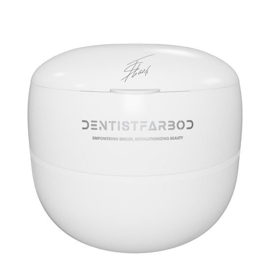 De DentistFarbod Pod reinigt met 45.000 Hz ultrasone golven tot in elke porie zonder borstelen, zonder schade. Eén druk op de knop en je bitje wordt klinisch schoon, precies zoals een tandarts het zou doen.
